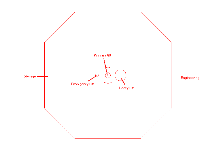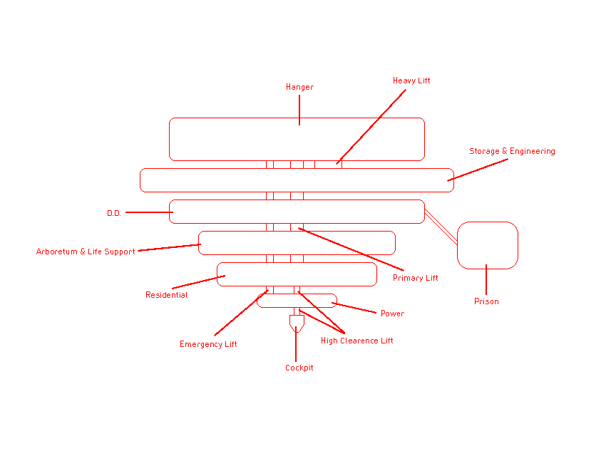 Floor 6 - Hanger: The hanger is the home to every space ship stored and visiting. With a heavy lift going to and from engineering, it is easy to make any repairs needed. The hanger can hold up to ten ships at a time.